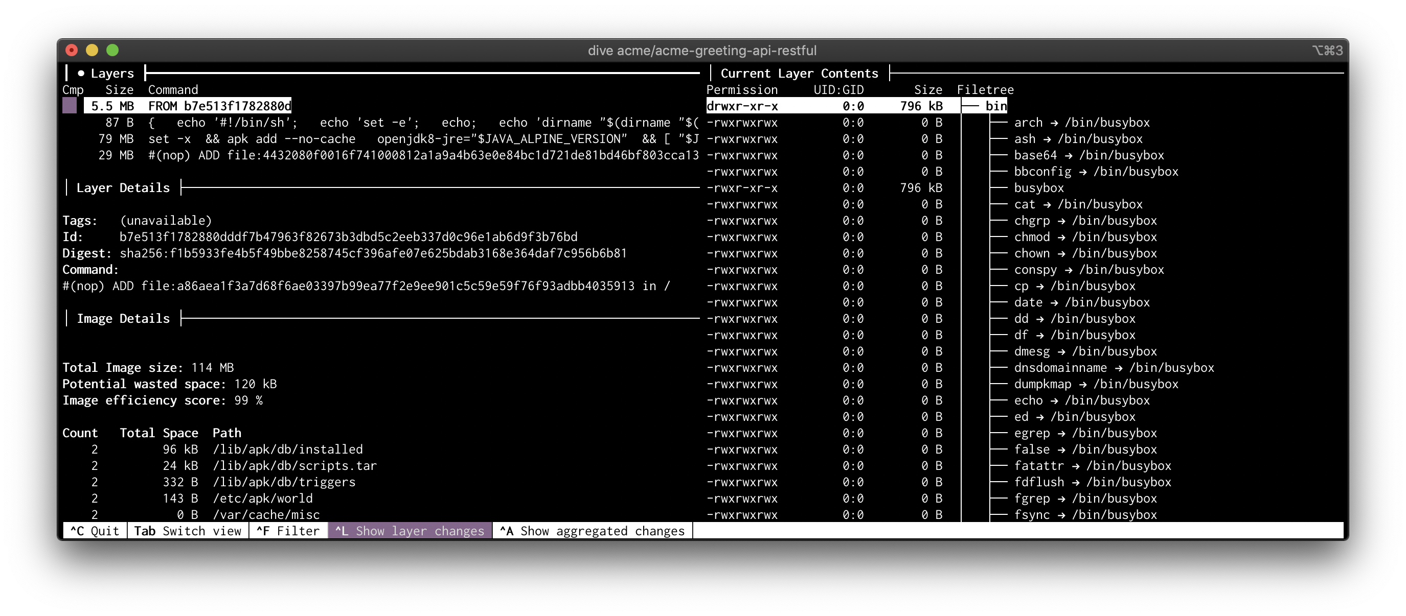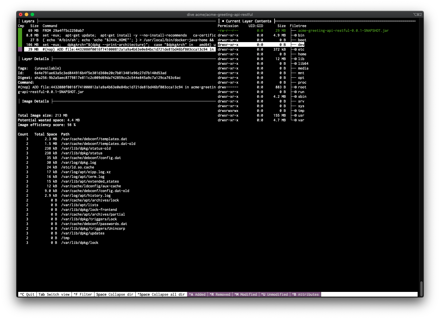 docker run --rm -it -v /var/run/docker.sock:/var/run/docker.sock wagoodman/dive:v0.9 acme/acme-greeting-api-restful