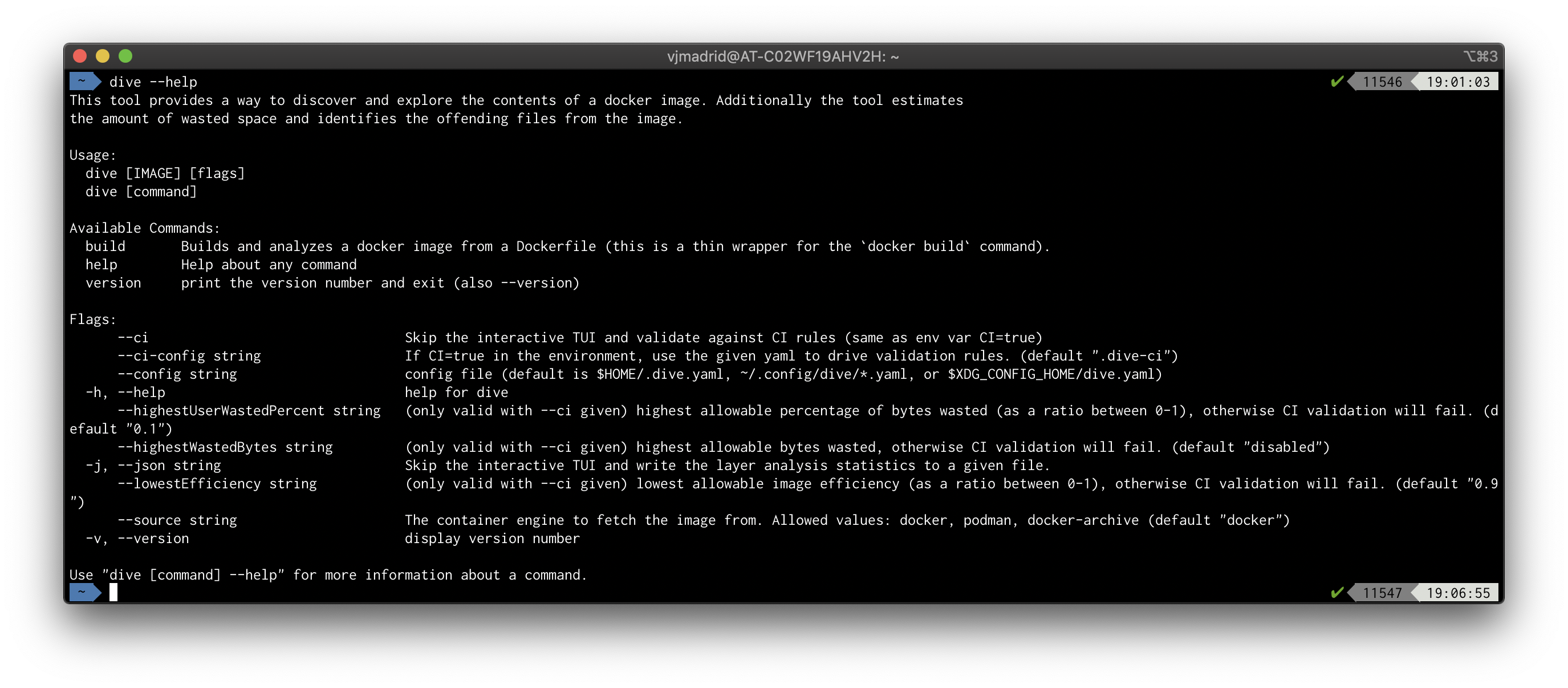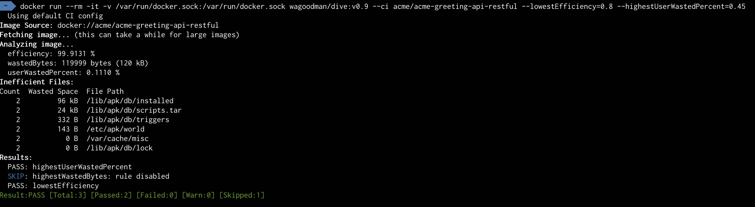 docker run --rm -it -v /var/run/docker.sock:/var/run/docker.sock wagoodman/dive:latest --ci <IMAGE_TAG> --lowestEfficiency=0.8 --highestUserWastedPercent=0.45