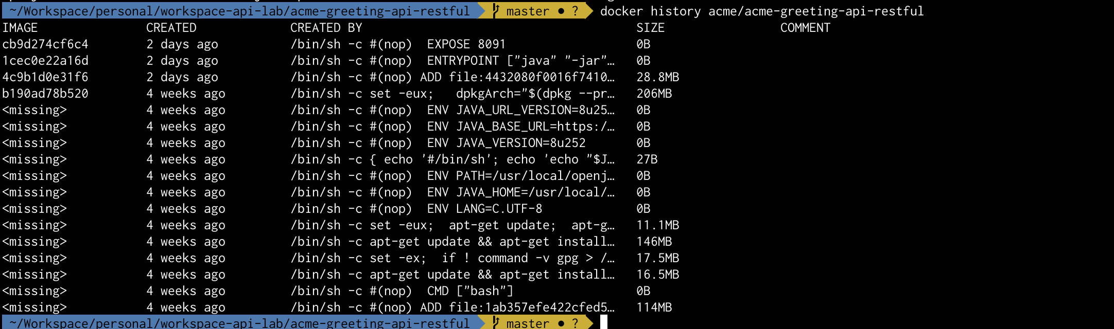 - Tratar de disponer de una imagen con un consumo mínimo a nivel de tamaño, entendiendo que es lo mínimo y necesario que necesitaban mis microservicios para funcionar (en mi caso los microservicios estan hechos con Java 8 / Spring Boot)