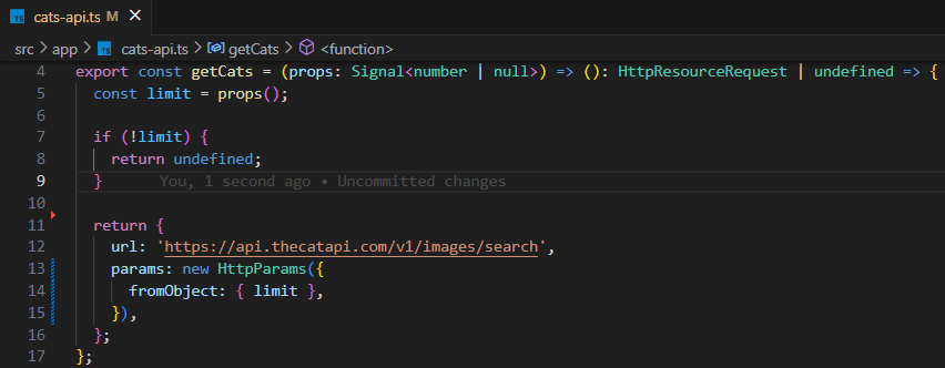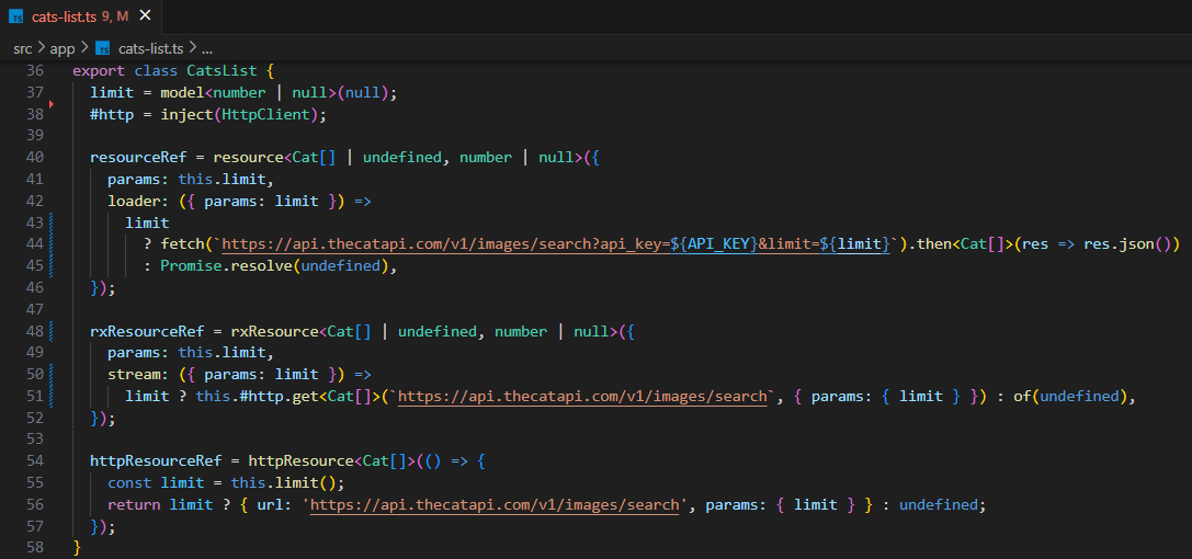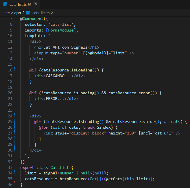 transforma la petición HTTP en un HttpResourceRef que el template puede consultar directamente mediante catsResource.value(), catsResource.isLoading() y catsResource.error().