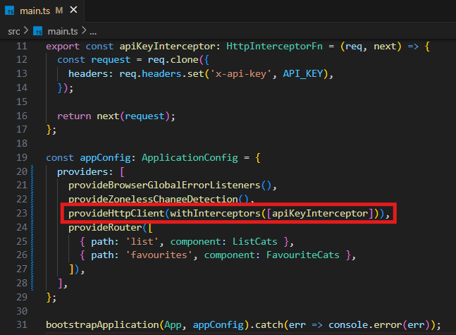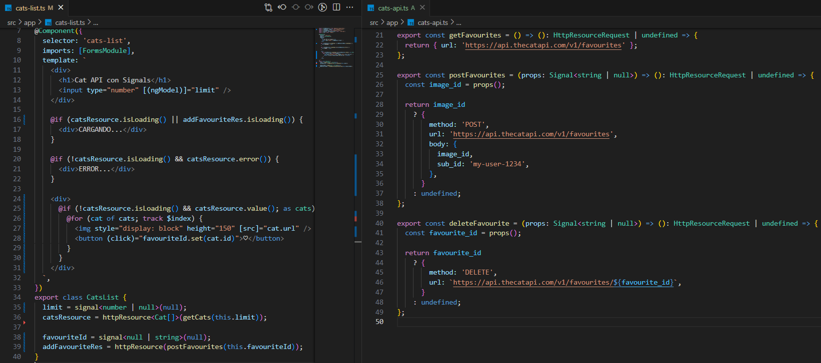 Se han agregado al componente el Signal favouriteId y el ResourceRef addFavouriteRes para poder agregar favoritos reactivamente siempre que se hace favouriteId.set(cat.id).