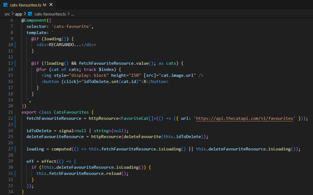 fetchFavouriteResource: Es unhttpResourceque realiza una peticiónGETa la API de TheCatAPI para obtener la lista de gatos favoritos. Su valor es reactivo y puede ser recargado manualmente con.reload().idToDelete: Es un Signal que mantiene el ID del gato a eliminar. Se actualiza al hacer clic en el botón "X" de cada imagen.deleteFavouriteResource: Es otrohttpResource, configurado con una funcióndeleteFavouriteque toma el ID del gato como parámetro y genera la peticiónDELETEcorrespondiente.loading: Es uncomputedque combina los estados de carga de ambas peticiones (fetchFavouriteResourceydeleteFavouriteResource) para mostrar un mensaje mientras se realiza cualquier operación.eff: Es uneffectque observa el estado dedeleteFavouriteResource. Cada vez que termina una eliminación, actualiza la lista de favoritos mediantefetchFavouriteResource.reload().