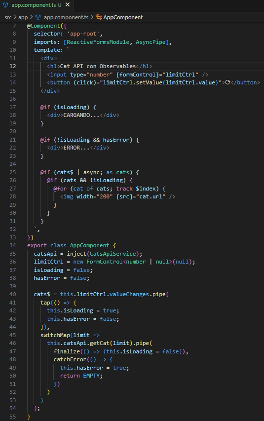 Una solución común es utilizar un FormControl para capturar el valor del input y suscribirse a los cambios mediante valueChanges. Al cambiar el valor, se emplea switchMap para cancelar peticiones anteriores y realizar una nueva. El estado de carga (isLoading) y el error (hasError) se gestionan manualmente. En la plantilla, se usa AsyncPipe para suscribirse al observable cats$.