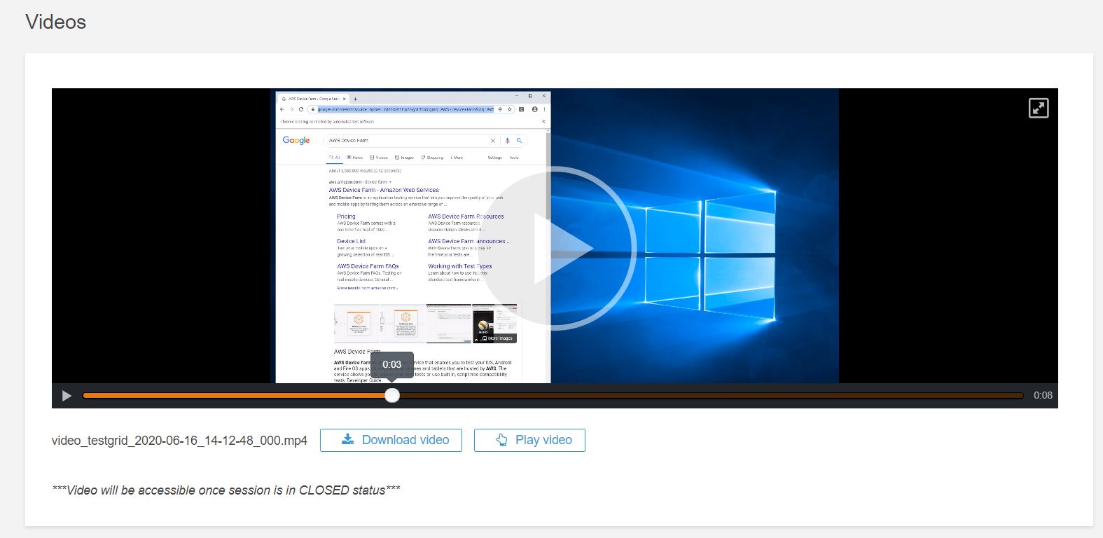 Una vez finalice, podremos visualizar los datos de la ejecución. Para ello, hacemos clic en la sesión y podremos visualizar el vídeo, las acciones de Selenium y las trazas.