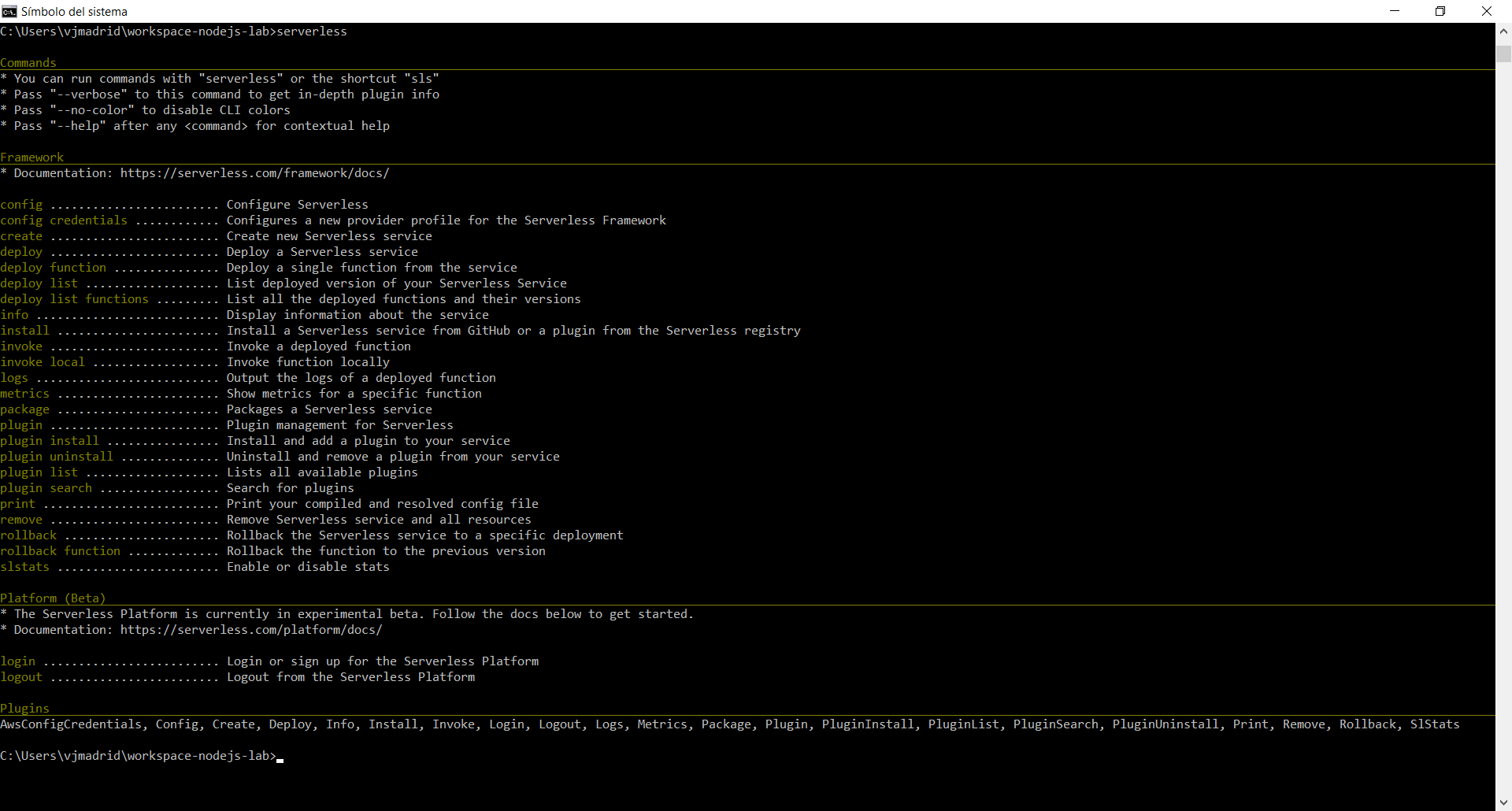Una vez instalado se puede acceder a su funcionalidad utilizando el comando: serverless o sls.