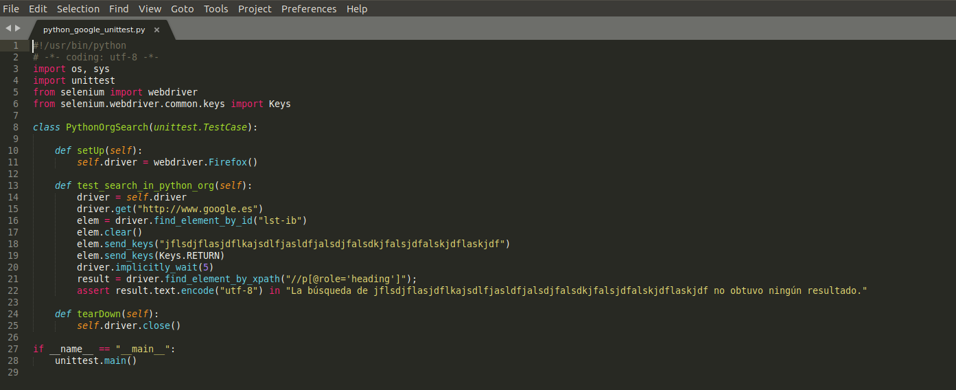Para generar nuestros tests, abrimos un editor en Linux (para este post utilizamos Sublime Text) y creamos un nuevo fichero. Le llamaremos: python_google_unittest.py.
