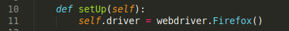 En nuestro primer método de setUp estableceremos aquellas acciones a realizar antes de la ejecución del test. En este caso, indicamos que el navegador será Firefox: