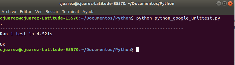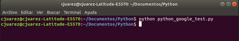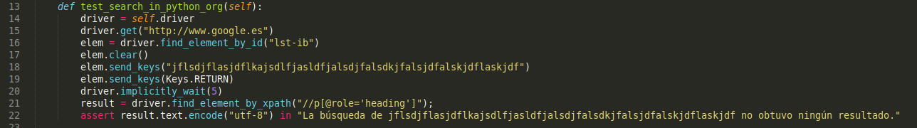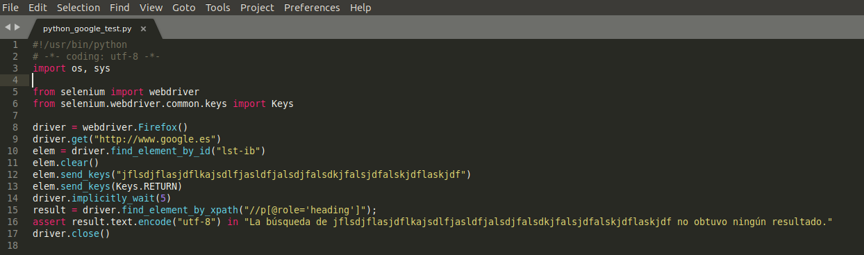 Ahora realizaremos el mismo test como si de un test funcional se tratase. En este caso no definiremos el tipo de test ni diferenciaremos por métodos, sino que escribiremos todas las instrucciones de forma secuencial. Lo llamaremos python_google_test.py: