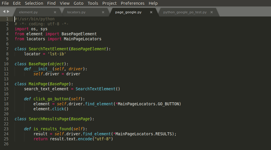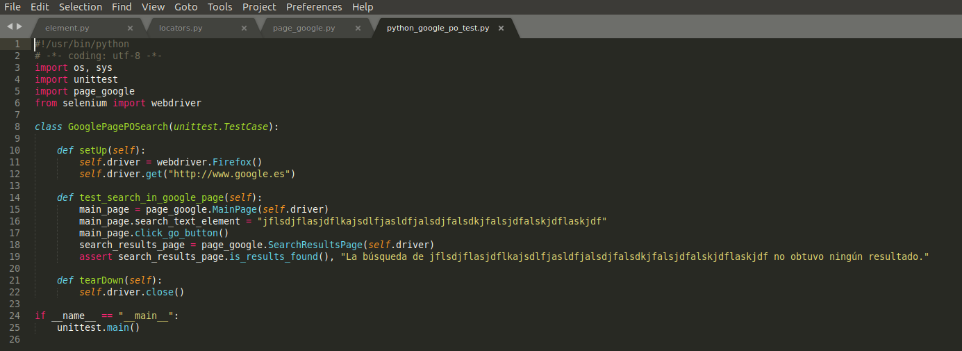 Aunque tiene prácticamente el mismo aspecto que el test unitario, podemos observar cómo utiliza objetos en lugar de contener las instrucciones de forma secuencial. Podemos verlo en la cabecera, importando la clase page_google y en la definición de la variable main_page, utilizando los métodos necesarios para la realización del test.
