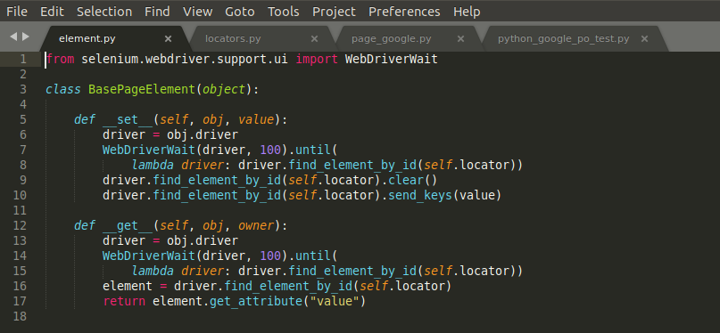 Dentro de esta clase, importamos las clases locators y element, en las cuales la primera incluirá los nombres de los localizadores de los elementos (identificador, xpath, etc.) y la segunda serán los métodos inherentes de accesibilidad a los elementos de tipo texto (acciones GET y SET).
