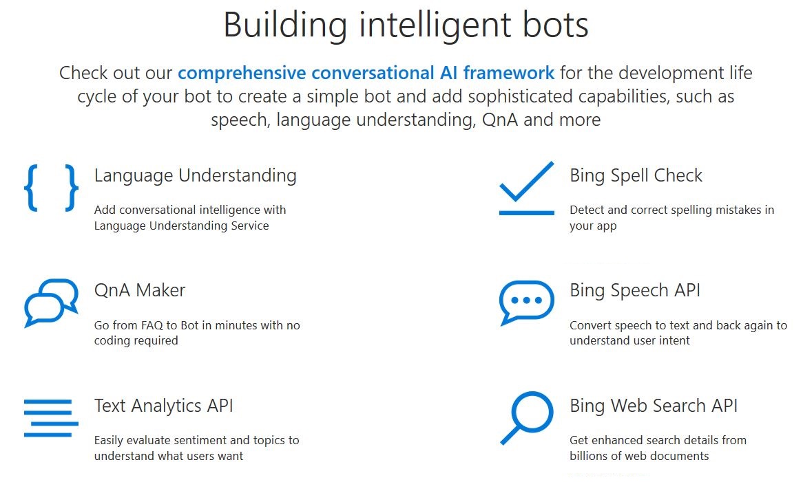 La inteligencia (IA) de un bot, no la vamos a programar nosotros, la delegaremos a alguna de las plataformas que existen en el mercado, como los Servicios Cognitivos de Microsoft en Azure que vimos en un post anterior, siendo estos una lista de los servicios más comunes: