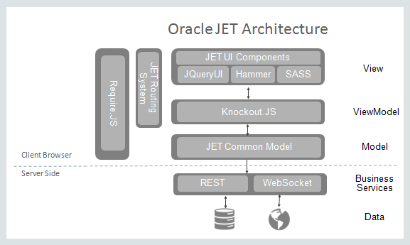 Oracle JET no es un framework propio. Es un conjunto de librerías que ya existían en el mercado y las han unido para crear un kit de desarrollo JS estable y productivo.
