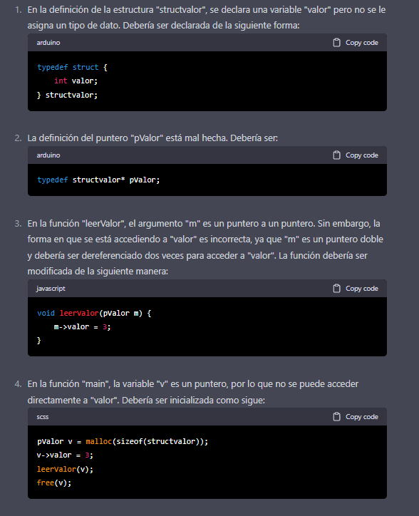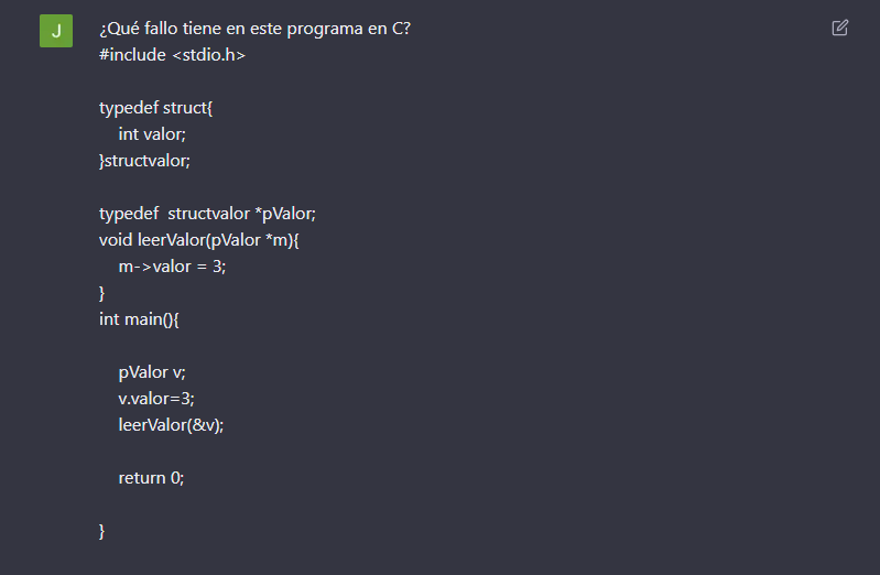 Pues empezando por lo más obvio es que es capaz de corregir cualquier código en cualquier lenguaje de programación. Y no solamente te lo corrige, sino que también te explica el error y te propone soluciones, veámoslo con un ejemplo básico realizado en C: