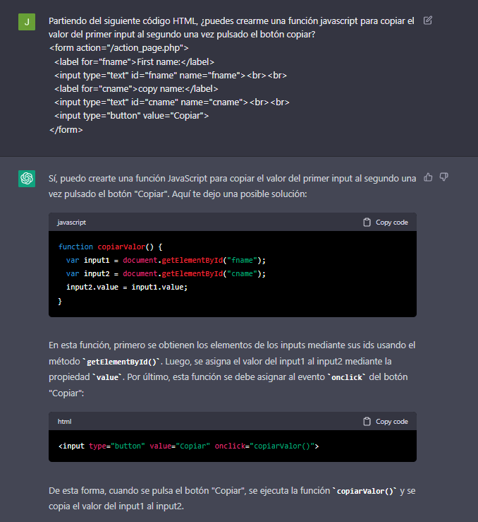 Lo importante no es solamente que te ha dado la respuesta, si no que a partir de aquí puedes seguir manteniendo una conversación con el chat y seguir pidiéndole cambios y/o adaptaciones al código según las premisas que vayas necesitando, por ejemplo, podemos decirle que en realidad lo necesitamos en JQuery, y no hace falta volver a repetirle toda la pregunta.