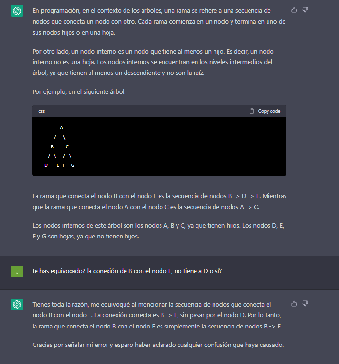 A veces también se equivoca, en la siguiente captura, que se le pregunta por los "árboles" en programación, comete un error al indicar un camino: