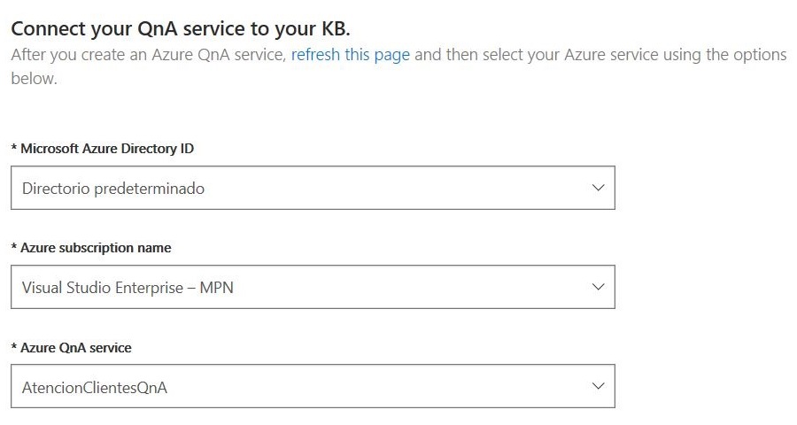 Ahora seleccionamos el QnA Maker que hemos creado en nuestra suscripción de Azure en los desplegables que aparecen en pantalla.