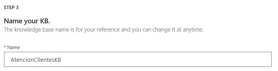 Introducimos el nombre para nuestra Knowledge Base, la llamaremos AtencionClientesKB