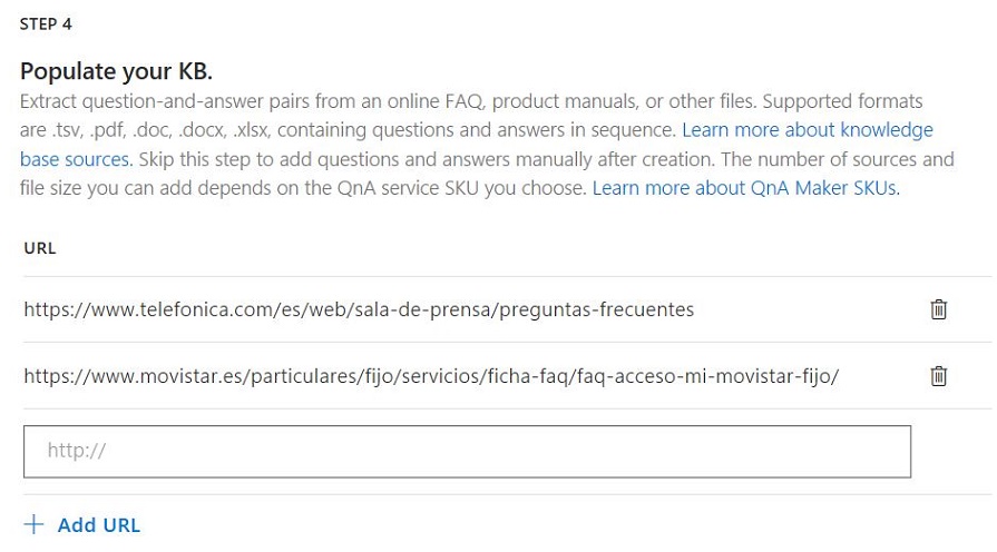QnA nos ofrece varias alternativas que podemos combinar para recopilar y rellenar nuestra KB, mediante URLs y archivos, con la premisa de que los datos deben estar estructurados en forma de preguntas y respuestas.