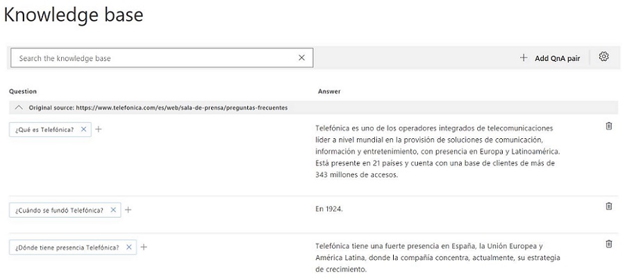 Una vez disponemos de KB, podemos de forma directa gestionarla desde el portal web para añadir y modificar contenidos siempre recordando que cada vez que cambiamos alguna cosa hay que volver a pulsar el botón Save and Train.