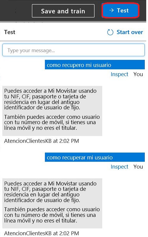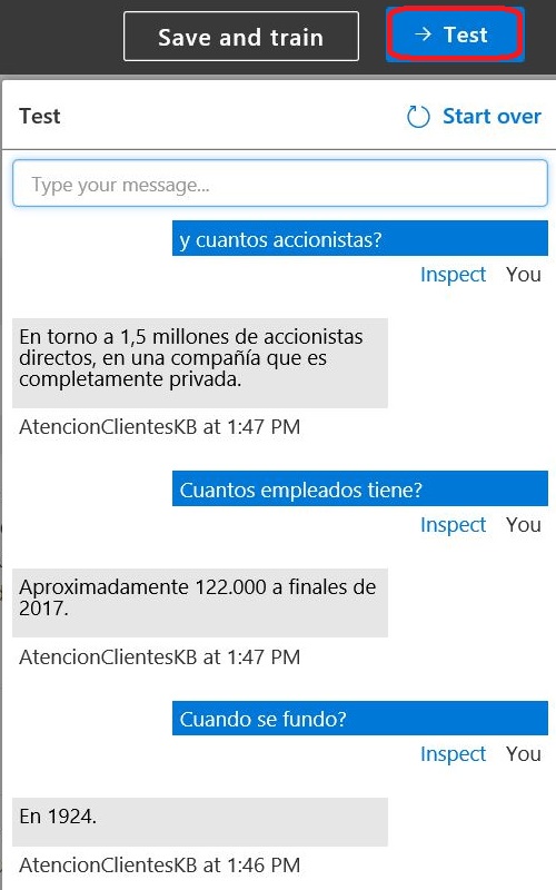 Para confirmar que nuestra KB funciona, realicemos una sencilla prueba directamente desde el portal QnA pulsando el botón Test, que nos abrirá un simulador de chat para verificar cómo responde.