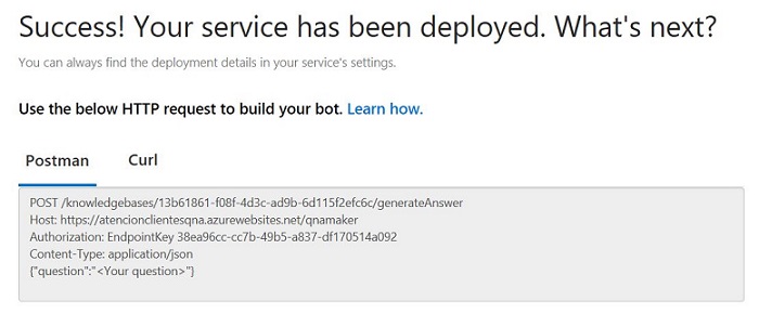 Con esto ya tenemos listo el QnA Maker en Azure, el siguiente paso será conectarnos.