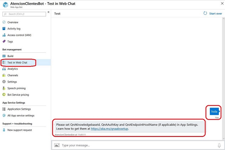 Recordamos que nos quedamos en la pantalla del ChatBot donde solicitaba 3 variables QnAAuthKey, QnAEndpointHostName y QnAKnowledgebaseId como vemos en pantalla.