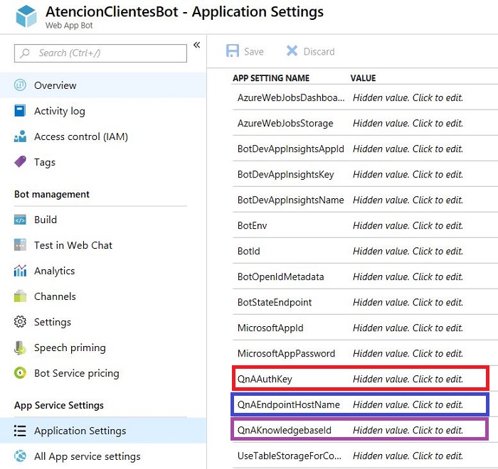 Hay que configurar estas variables en las Application Settings de AtencionClientesBot para indicarle los valores que nos retorna la Knowledge Base de QnA Maker justo después de publicar.
