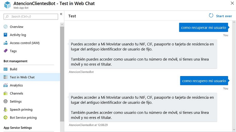 Ahora, comprobamos desde la pantalla Test in WebChat: escribimos de nuevo "cómo recuperar mi usuario" o "cómo recupero mi usuario" y vemos que efectivamente funciona.