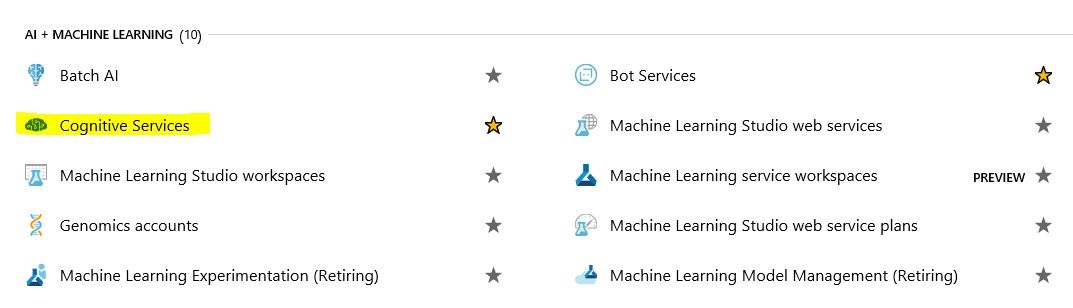 Al pulsar el botón se nos abrirá directamente al formulario en Azure. Si no fuera así, podemos crearlo dentro del portal de Azure seleccionando la opción de Cognitive Services y la categoría AI + MACHINE LEARNING.