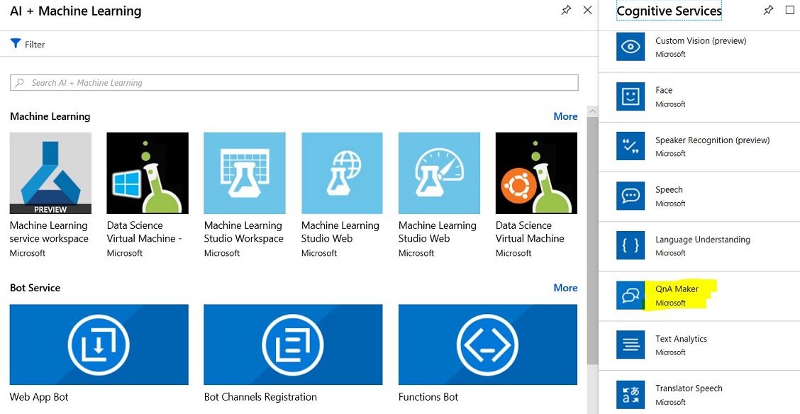 Buscamos QnA Maker en el catálogo de servicios o escribimos en el buscador “QnA” para localizarlo.