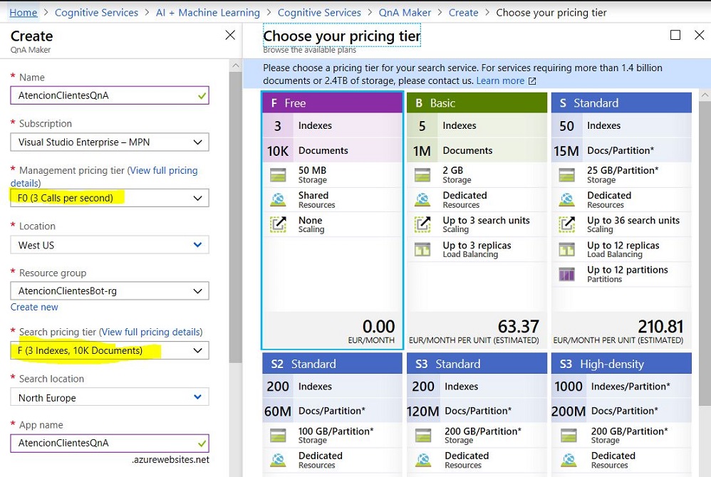En el resto de campos, indicaremos la suscripción, localización, grupo de recursos y debemos fijarnos bien en las 2 capas de precios (pricing tier) para seleccionar la gratuita (F = Free).
