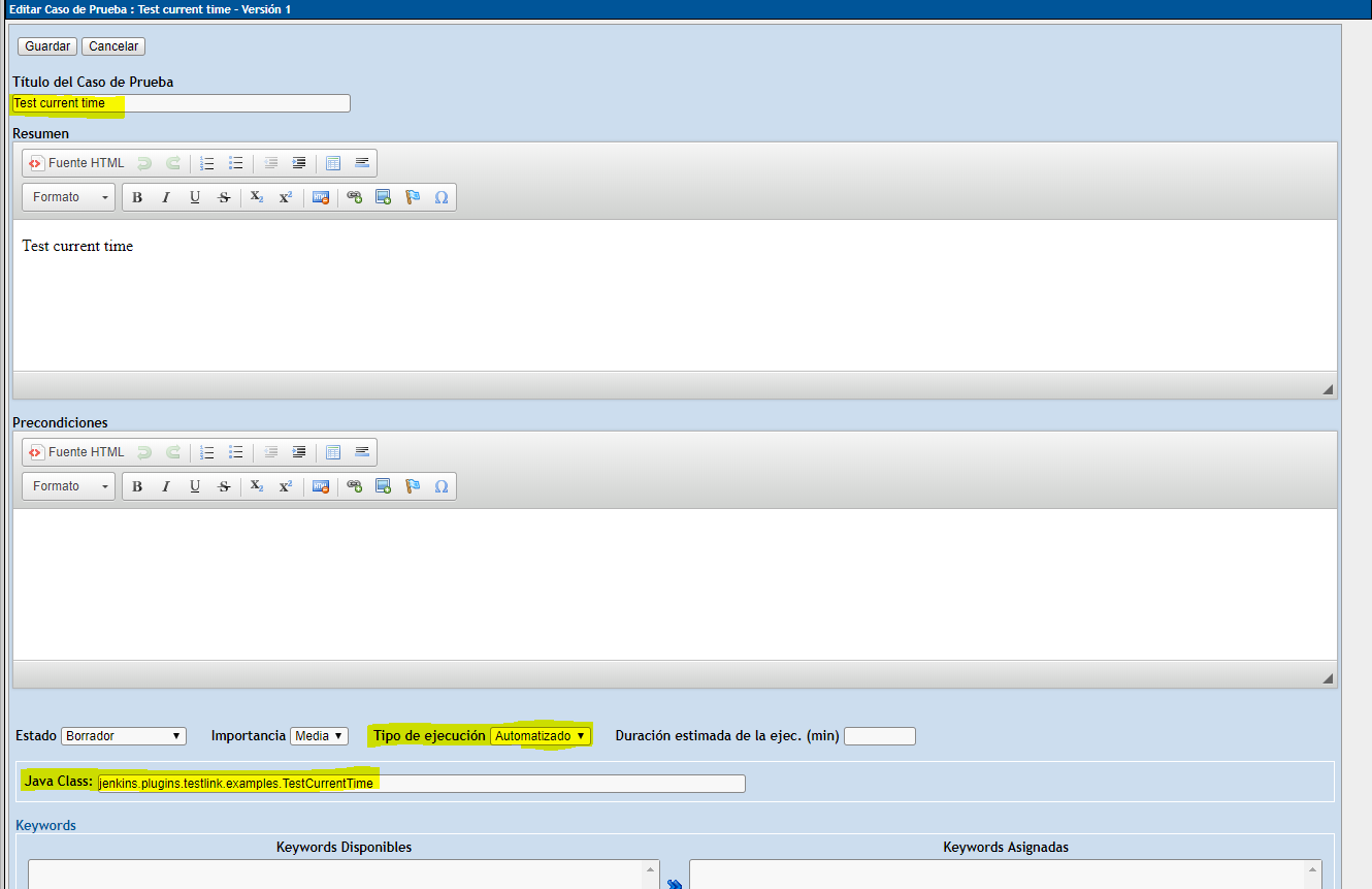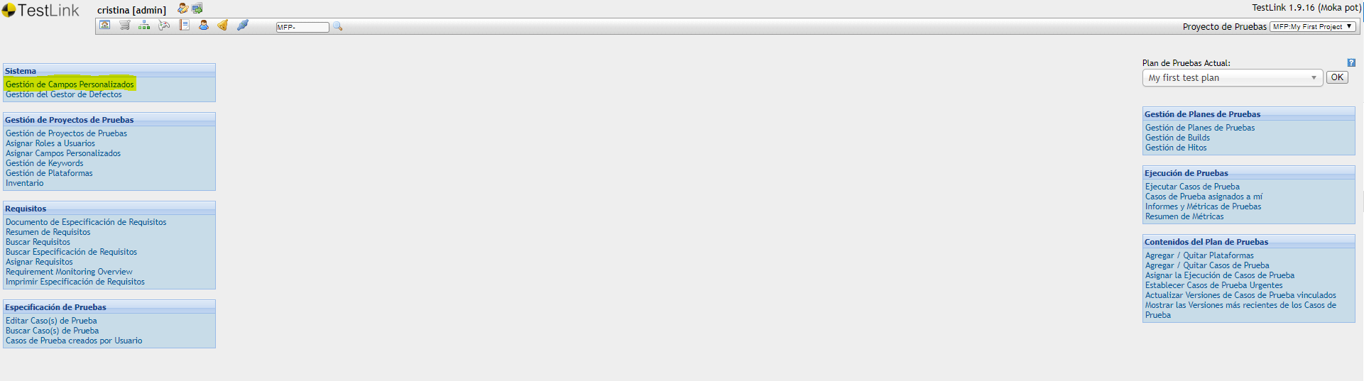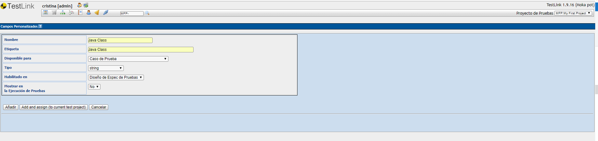 - Campos Personalizados : Indicamos el nombre del campo personalizado creado en TestLink.