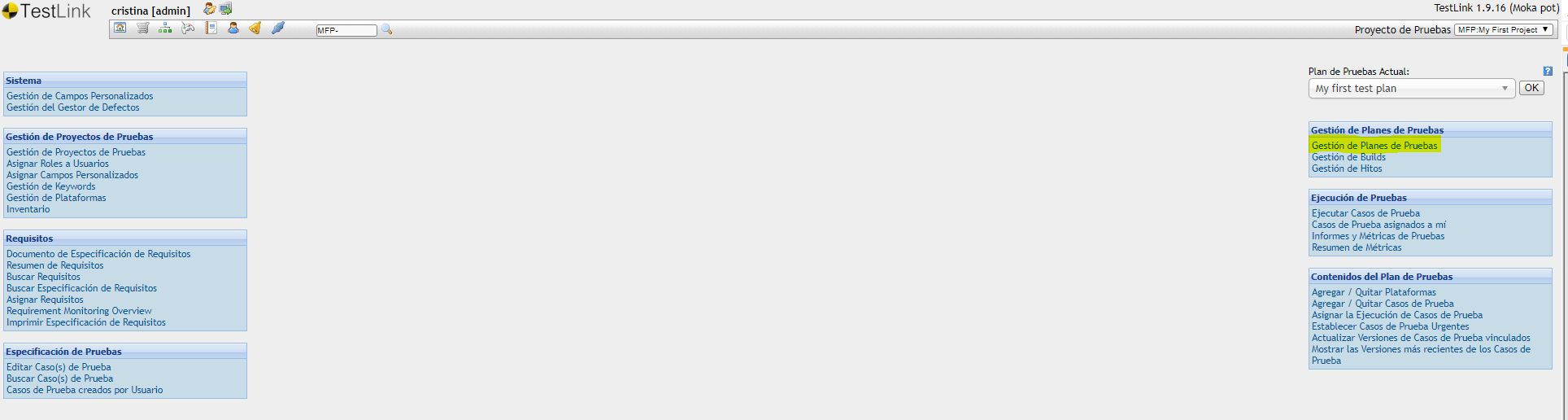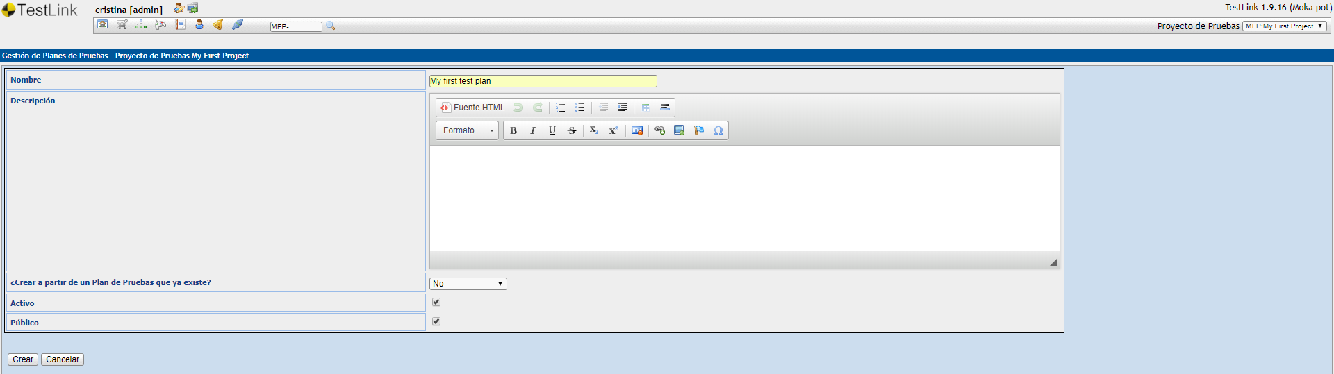 Una vez definidos todos los casos de prueba, será preciso la creación de un plan de pruebas para proceder a su ejecución. En el menú principal iremos a Gestión de Planes de Pruebas > Crear: