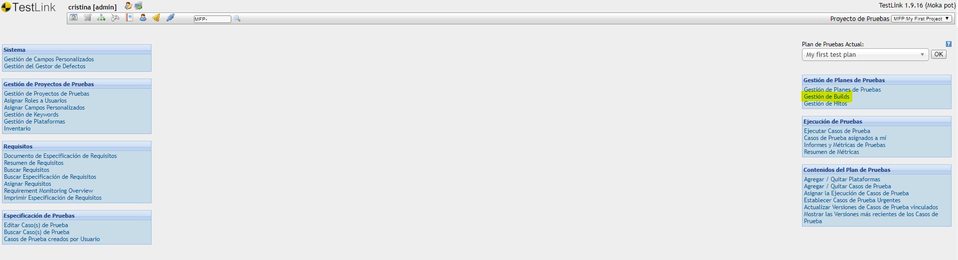 Creamos la Build que se vinculará con el Plan de Pruebas generado anteriormente. En el menú principal iremos al menú Gestión de Builds > Crear: