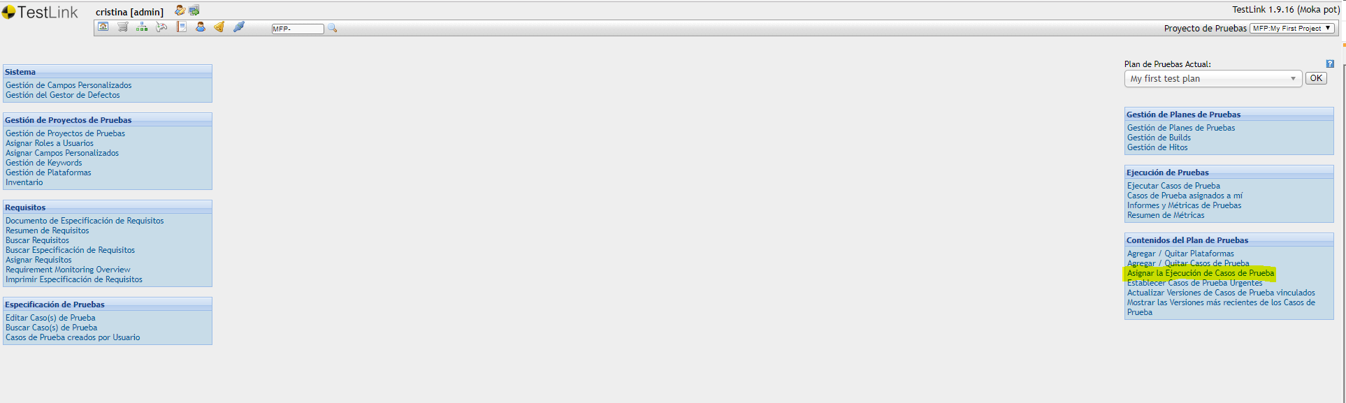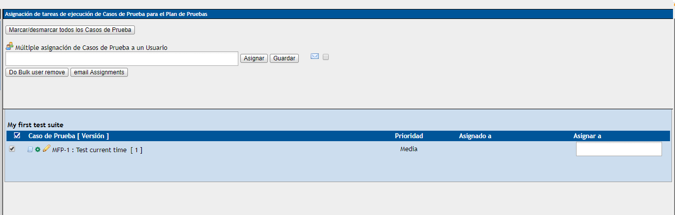 El último paso consistirá en añadir los casos de prueba que se ejecutarán en la Build creada. En el menú principal iremos al menú Asignar la Ejecución de Casos de Prueba: