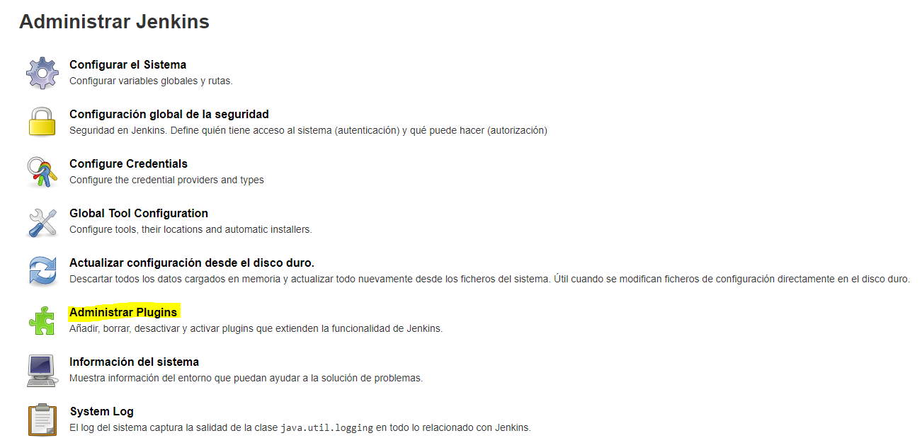Antes de generar el proyecto deberemos instalar el plugin de TestLink en Jenkins. Vamos al menú Administrar Jenkins > Administrar Plugins. Buscamos e instalamos el plugin "TestLink Plugin".