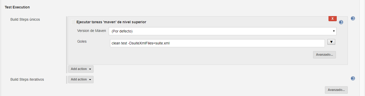 Dentro del apartado de Test Execution indicaremos la sentencia de ejecución del proyecto. En este caso le pasamos por parámetro el nombre de la suite, que contendrá la clase de test a ejecutar: