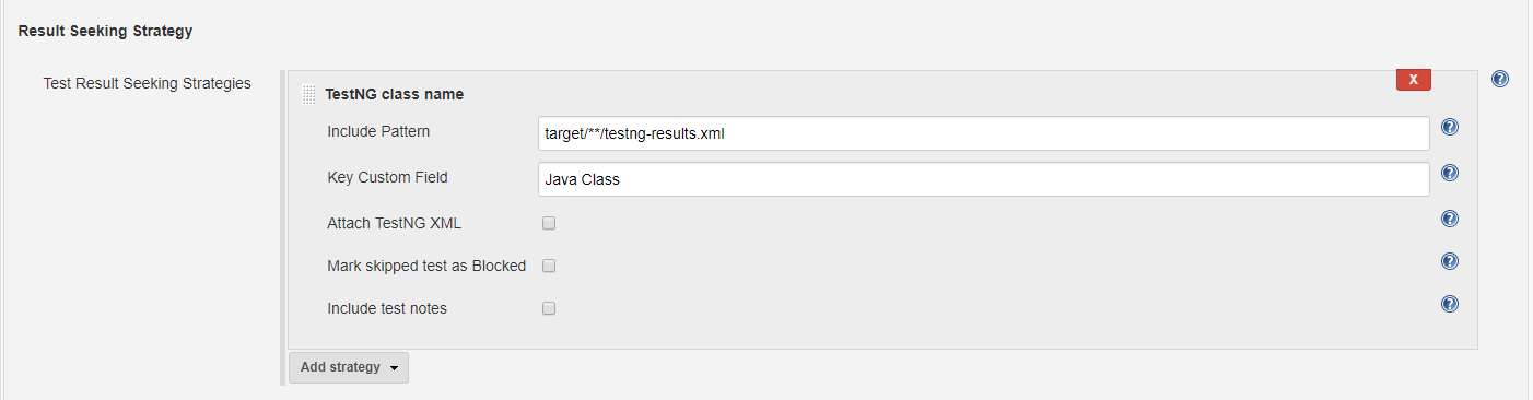 Importante: En este ejemplo hemos discriminado los tests por nombre de clase (el campo personalizado Java Class contiene el package y nombre de la clase a ejecutar), por tanto, deberemos escoger la opción TestNG class name. Existen otras opciones, como discriminar por suite o por método. Para que la vinculación funcione se debe utilizar el mismo tipo tanto en la configuración del campo personalizado en TestLink como en la opción seleccionada en la configuración de la estrategia de búsqueda de resultados en el job de Jenkins.