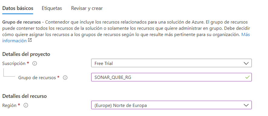 Azure te informará que la tienes que crear vinculada a un grupo de recursos (paso anterior)