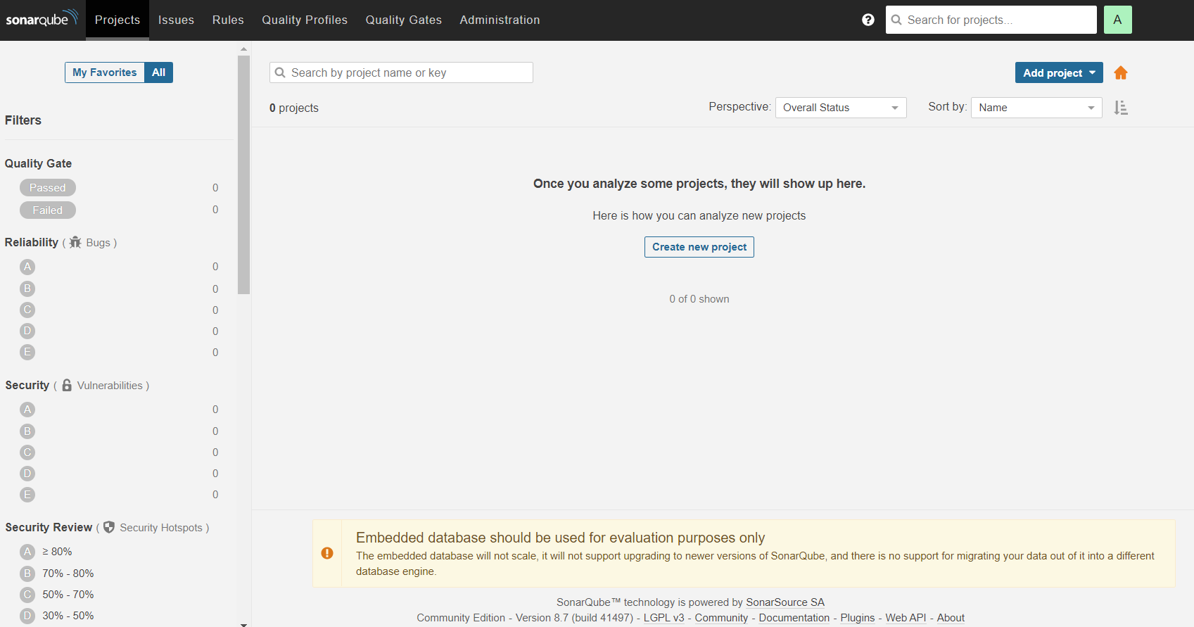 Al loguearse, pide cambiar la password. Tras ello, ya tendremos acceso a SonarQube: