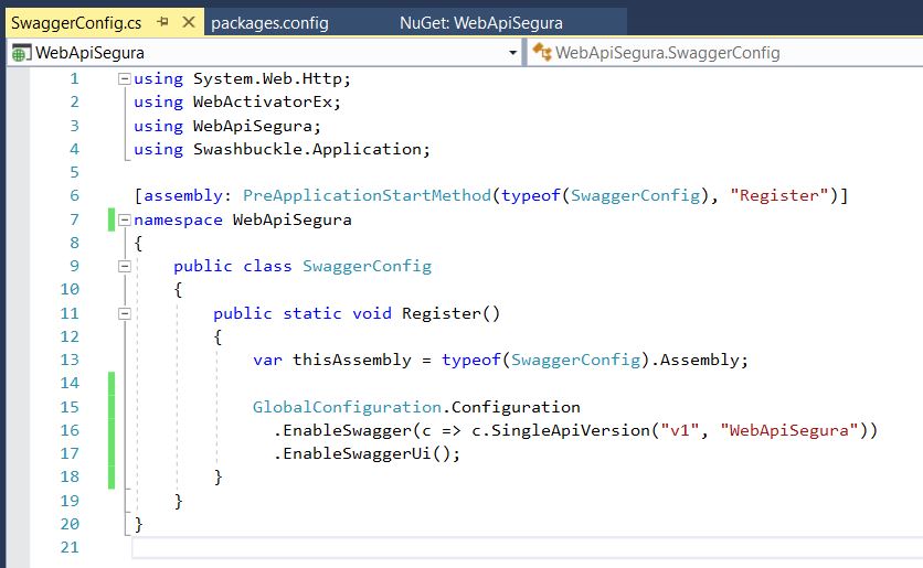Para confirmar que se ha instalado correctamente, veremos un icono verde en la interfaz gráfica, una nueva clase "SwaggerConfig.cs" en nuestra solución de Visual Studio y también se actualiza nuestro packages.config como vemos en la imagen.