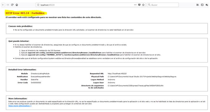 Ahora solo nos falta iniciar el proyecto WebAPI, si recordáis el artículo parte 2, al ejecutar, obtenemos un error 403 Forbidden, en realidad, no hay que preocuparse porque es un tema de configuración de IIS (tenéis la explicación en el articulo anterior) y no hacemos caso de este mensaje.
