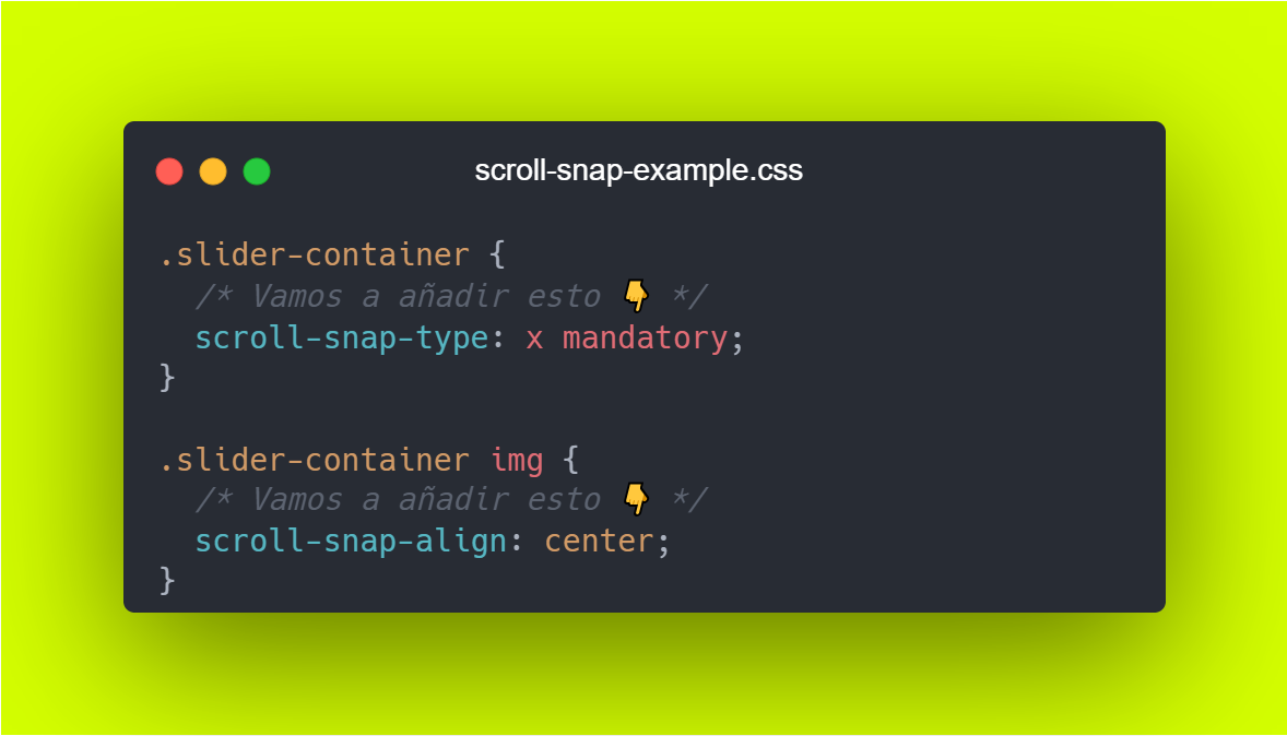 Nota importante a tener en cuenta: Hay que usar este overflow-x: scroll en el contenedor de nuestro carrusel, ya que si no estaríamos haciendo scroll sobre el elemento <body> y no estamos capturando el scroll del elemento .slider.