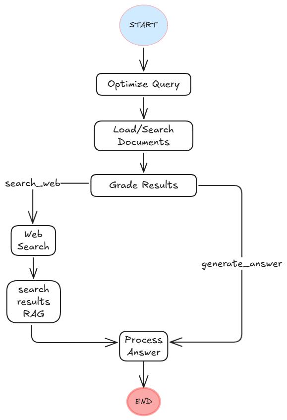 El flujo de trabajo de la imagen comienza con la optimización de la consulta del usuario, donde se reformula la pregunta del usuario para mejorar su eficacia en búsquedas vectoriales. Luego, el sistema carga, procesa y busca en documentos en la base de datos vectorial, a partir chunks semánticos y enriquecidos con metadatos contextuales. A continuación, el grafo evalúa la relevancia de los documentos encontrados mediante un modelo de grading, decidiendo si la información es suficiente o si se requiere una búsqueda en la web (usando Tavily) para alimentar el contexto. Si se necesita búsqueda web, los resultados se integran en un vectorstore temporal para realizar una búsqueda de similitud y extraer el contexto más relevante. Finalmente, el sistema procesa y genera una respuesta basada en el contexto acumulado, ya sea de la base de conocimiento local o de la web, asegurando una respuesta precisa y bien fundamentada.