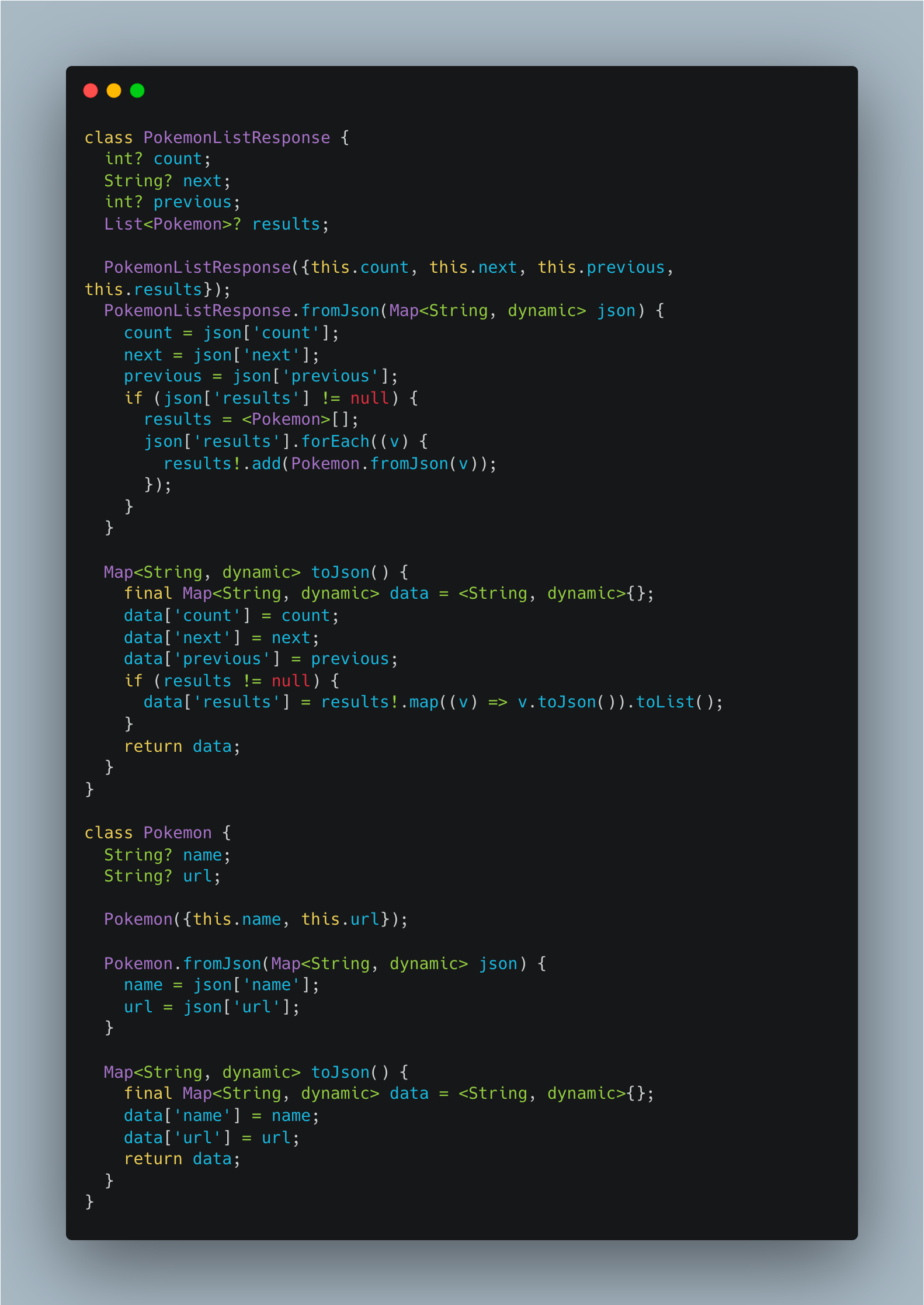 En nuestro proyecto, crearemos una carpeta llamada models que contendrá todos los modelos que usaremos. Para empezar, crearemos un nuevo fichero al que llamaremos pokemon_llist_response_model.dart e iremos creando el modelo de manera que el resultado final debería quedar así.
