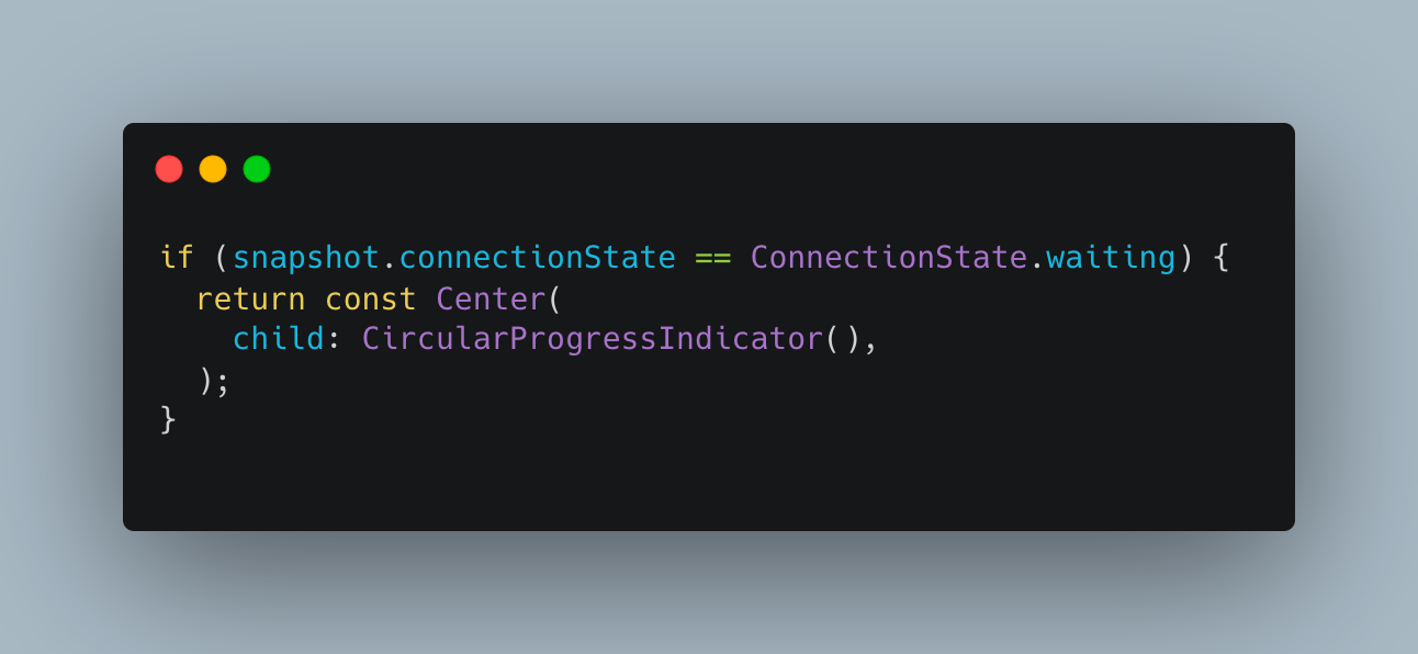 Ahora que ya tenemos la respuesta tipada, vamos a cambiar nuestra vista para mostrar correctamente los datos, pero antes, como mencioné en el post anterior, vamos a gestionar el estado de la petición para, por ejemplo, mostrar un 'loading' mientras esperamos la respuesta. Al hacer uso de FutureBuilder para construir la vista, en el snapshot que nos devuelve, podemos acceder a la propiedad connectionState para ver en todo momento el estado de la misma de manera que podemos comprobar si la respuesta está en espera y mostrar un loading de la siguiente forma:
