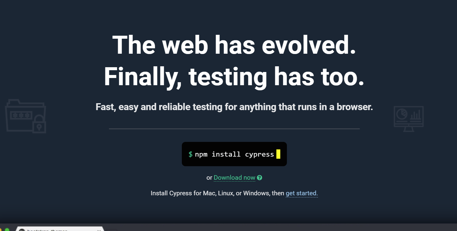 En primer lugar, deberemos instalar Cypress. Para ello, vamos a la página oficial https://www.cypress.io/ y hacemos click en Download now: