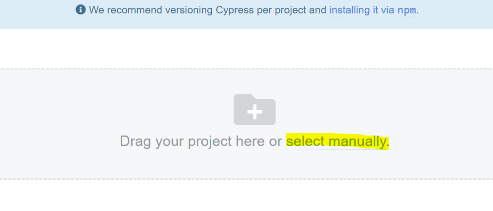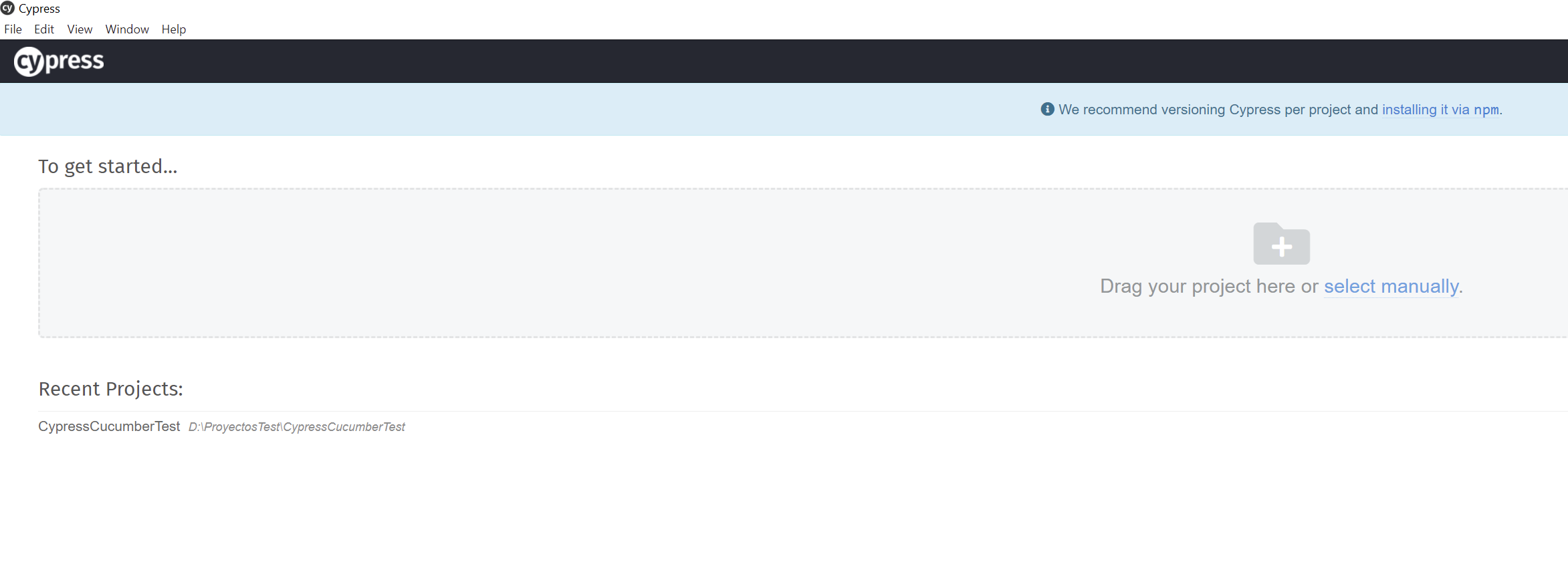 O bien podemos ejecutarlo a través del Dashboard de Cypress. Para ello, abrimos el Dashboard y seleccionamos el proyecto, si lo tenemos en proyectos recientes o lo abrimos manualmente:
