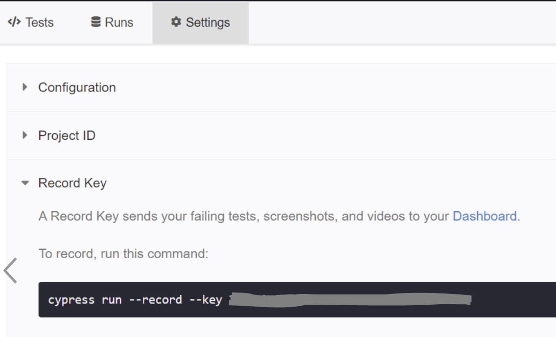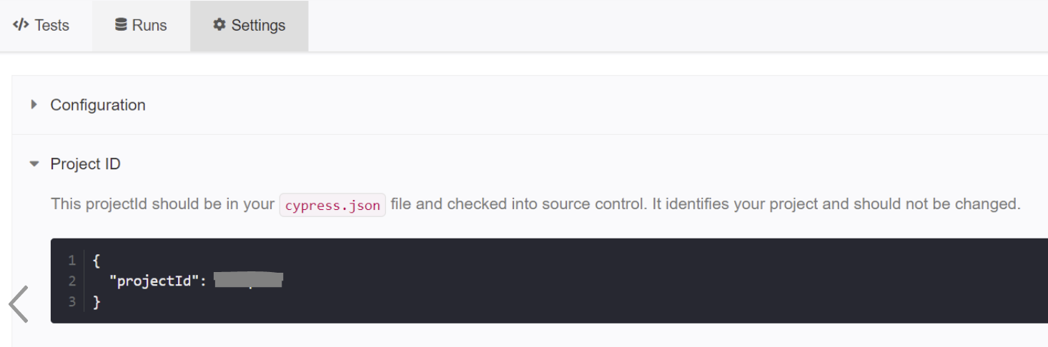 Vamos a la pestaña Settings y dentro de Project ID veremos que se nos ha generado un identificador del proyecto. Este ID deberemos indicarlo dentro del proyecto, en el fichero "cypress.json"