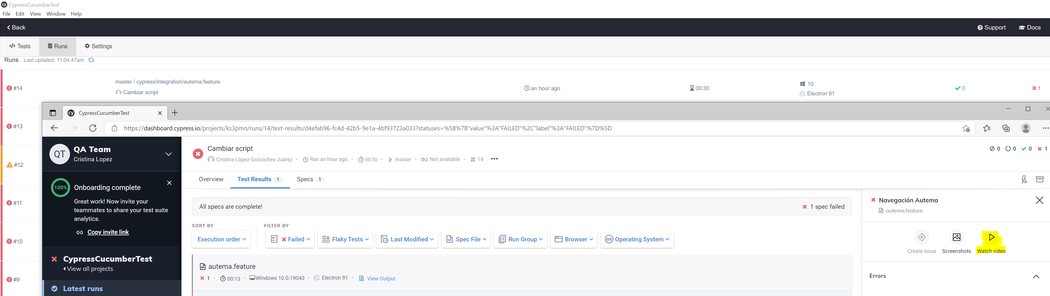 El primer paso es bajar el código fuente del proyecto en Cypress desde Git. Una vez bajado, ejecutamos el test activando el recording de la ejecución. Finalmente, sea cual sea el resultado, creamos, mediante el plugin Jira-Steps, una nueva issue obteniendo en tiempo real la key de la issue creada y hacemos el upload del video ubicado en el directorio "videos" a la issue recién generada. En la descripción añadimos el texto del fichero de resultados JUnit generado. Por último hacemos un clean workspace ya que si volvemos a ejecutar el mismo test nos fallará a la hora de generar el video ya que éste existe (otra opción es hacer un borrado específico del video después de subirlo a la issue generada).